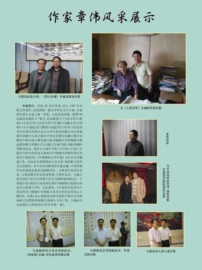 章伟,男,中国汉族作家、诗人、编辑,1983年9月14日生于安徽省庐江县,1997年开始文学创作,作品散见于 《人民日报》《中国文化报》《文艺报》《安徽日报》《安徽青年报》《南方都市报》《新安晚报》《齐鲁晚报》《燕赵都市报》《深圳法制报》《诗刊》《诗林》《人民文学》《安徽文学》《山东文学》《天涯》《星星诗刊》《北方文学》《散文诗》《西湖》《青少年文艺》《淮南文艺》等报刊杂志,部分文字或生平收入《永存的报春花》《鹤城文萃》《中国网络诗选》《中国现代诗歌经典》《名家评于炼的诗》《中国网络文学年选》《现代诗歌100家》《21世纪精品诗歌选·中国卷》《80后名诗精选》等,作品多次获得国内文艺大奖。